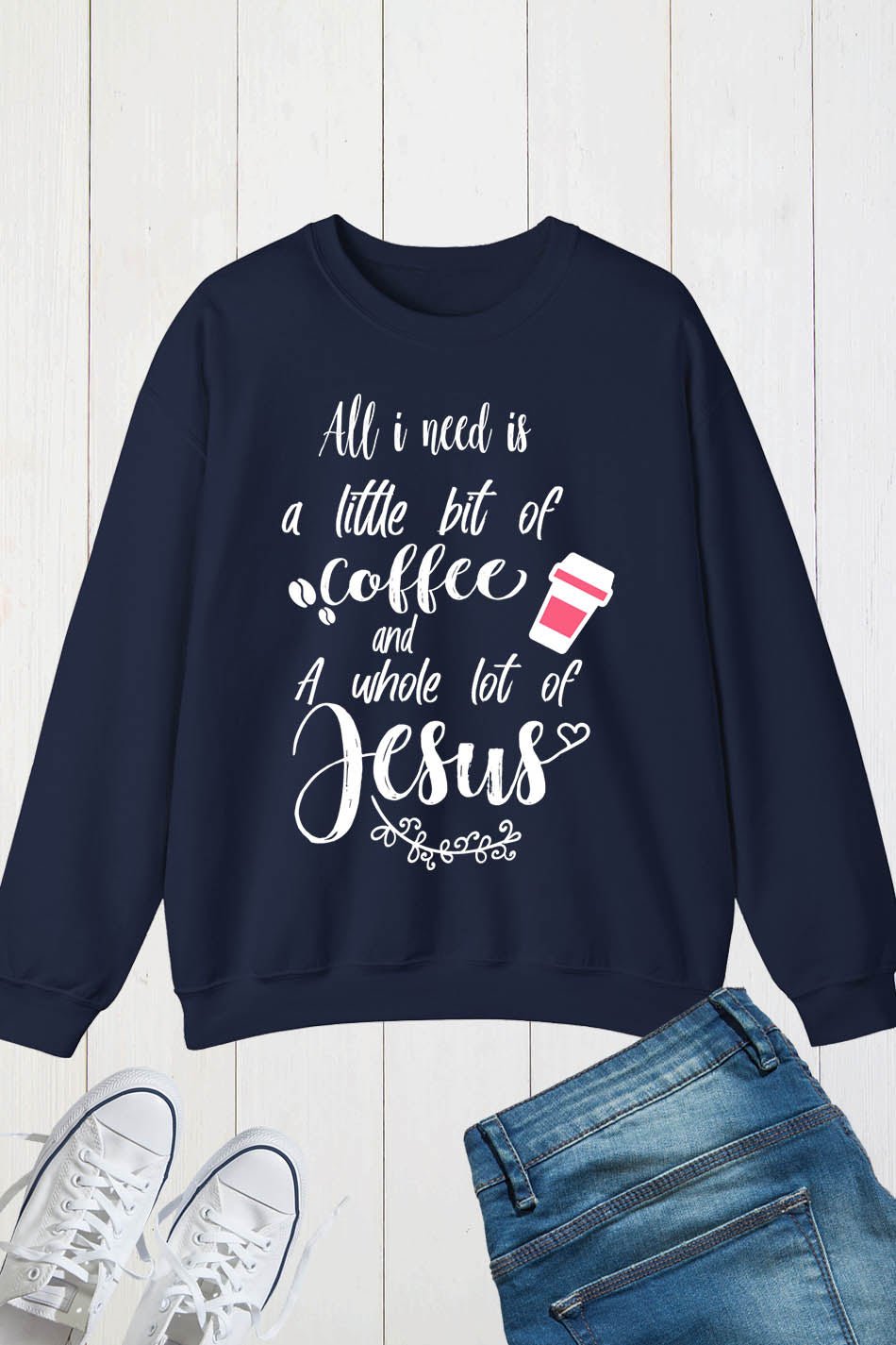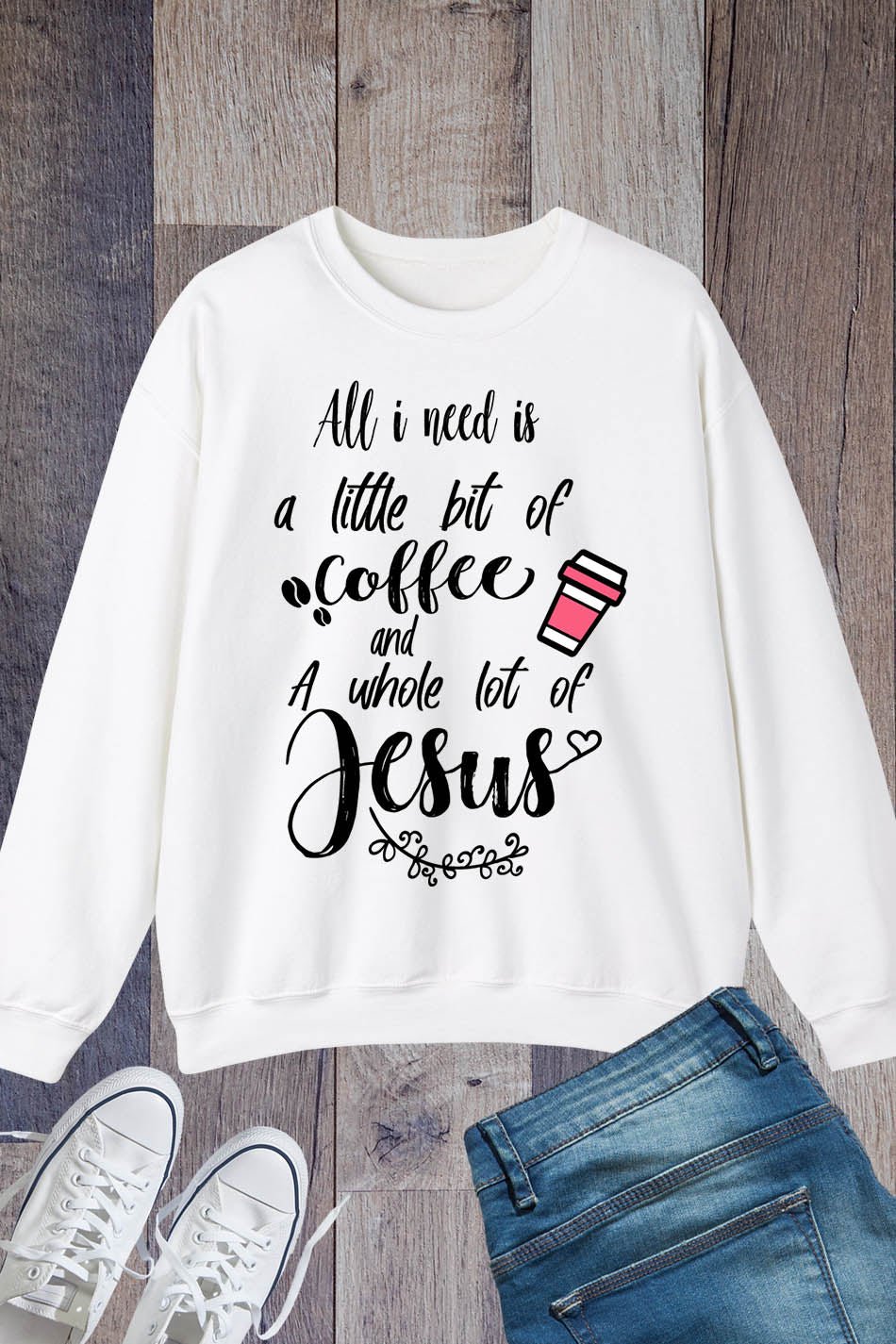 Introducing our “All I Need is a Little Bit of Coffee and a Whole Lot of Jesus” sweatshirts. With their cozy material and inspiring slogan, these sweatshirts are perfect for those who love coffee and seek strength from their faith. Whether you’re lounging around or out running errands, these sweatshirts are a stylish reminder of the two things that fuel your day.