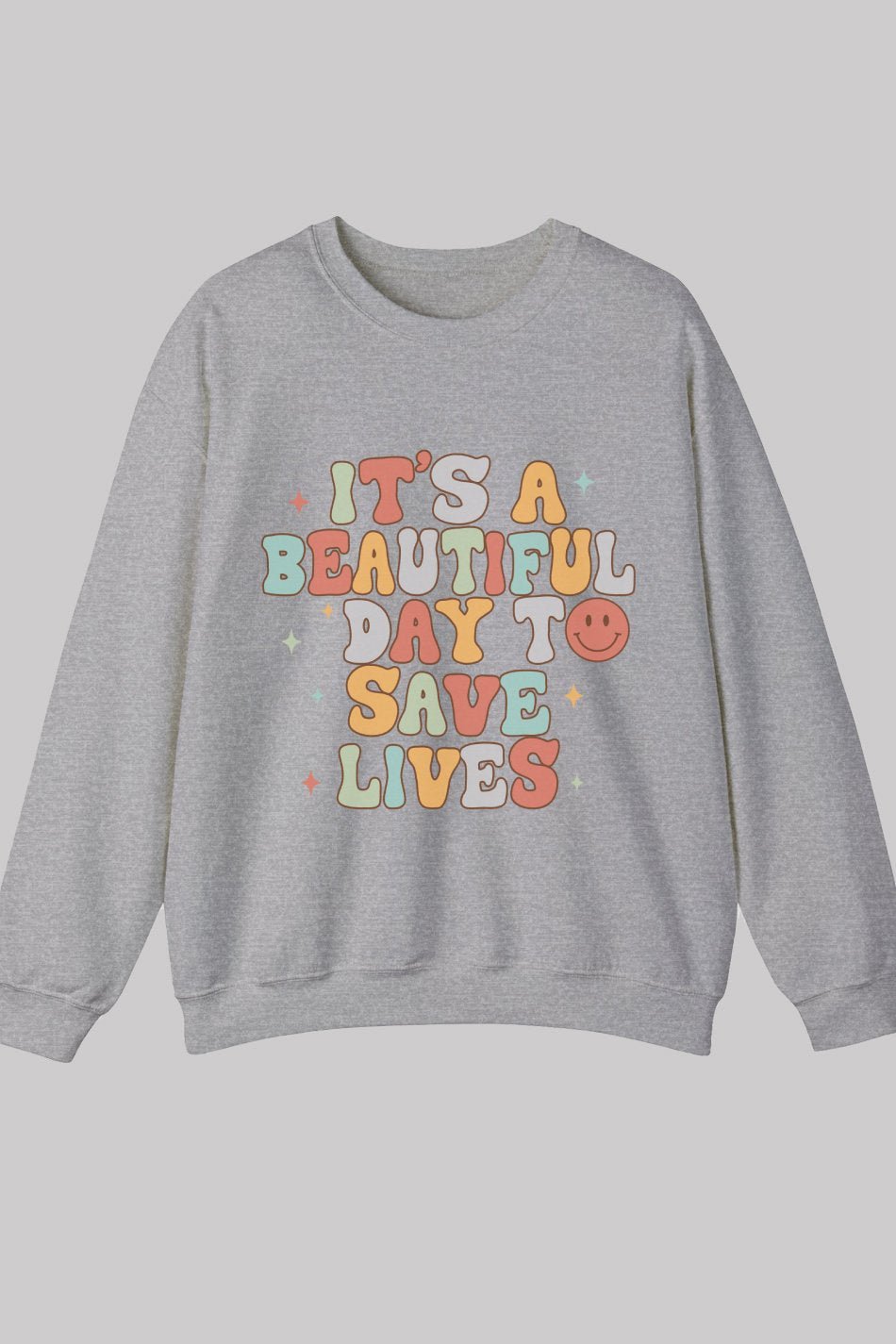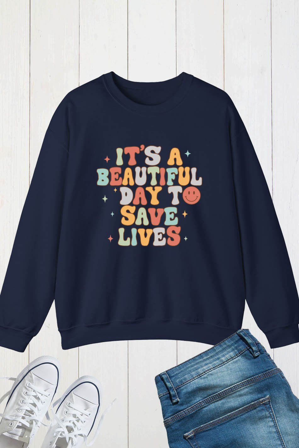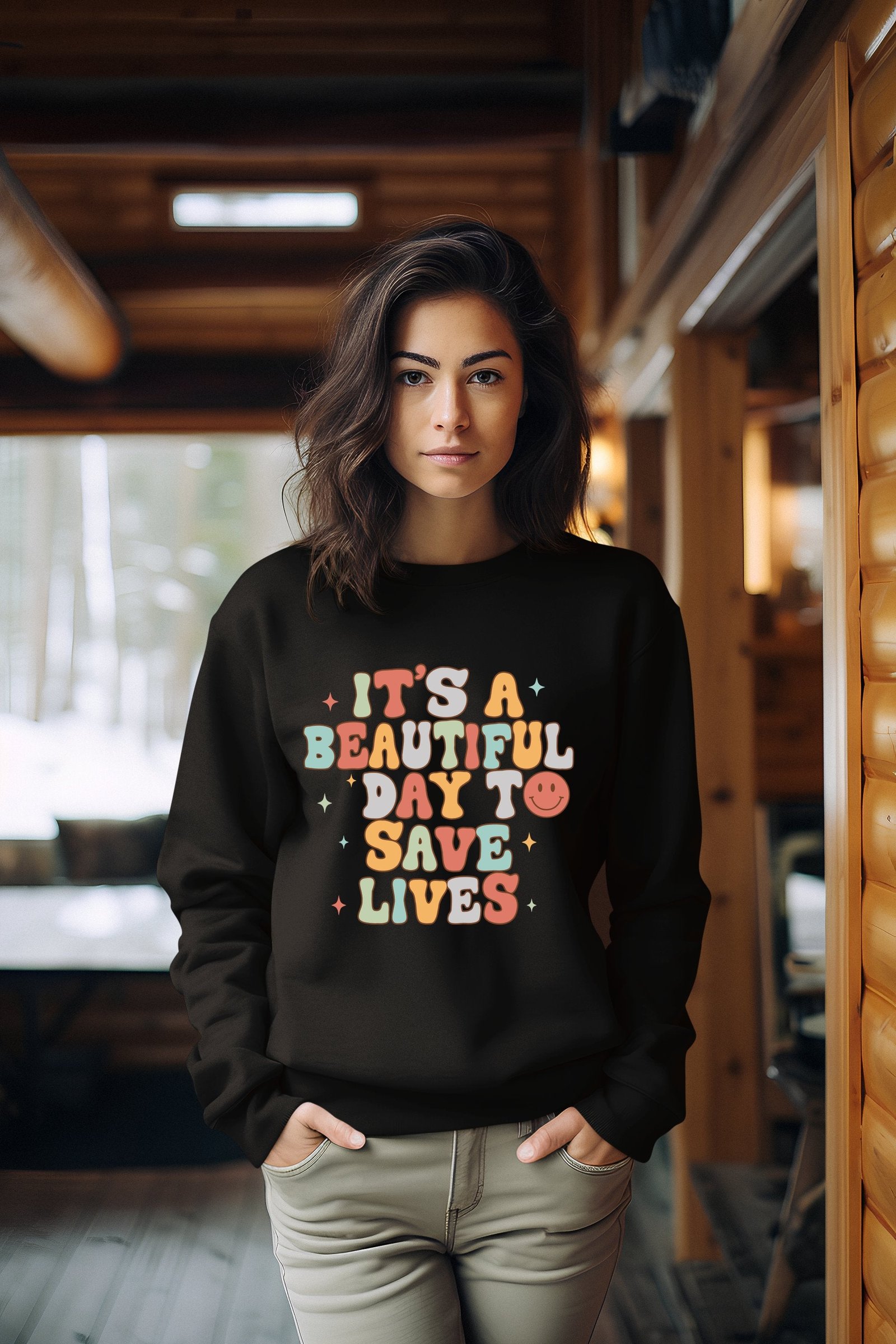 Expertly crafted, this Beautiful Day To Save Lives Nurse Sweatshirt is perfect for any nurse looking for style and comfort. Made with high-quality materials and featuring a timeless design, this sweatshirt not only keeps you warm but also showcases your dedication to saving lives. Stay cozy and stylish on those busy days in the hospital.