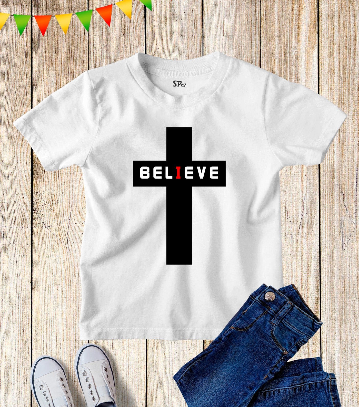 Kids Christian T Shirt Believe Jesus Christ Cross