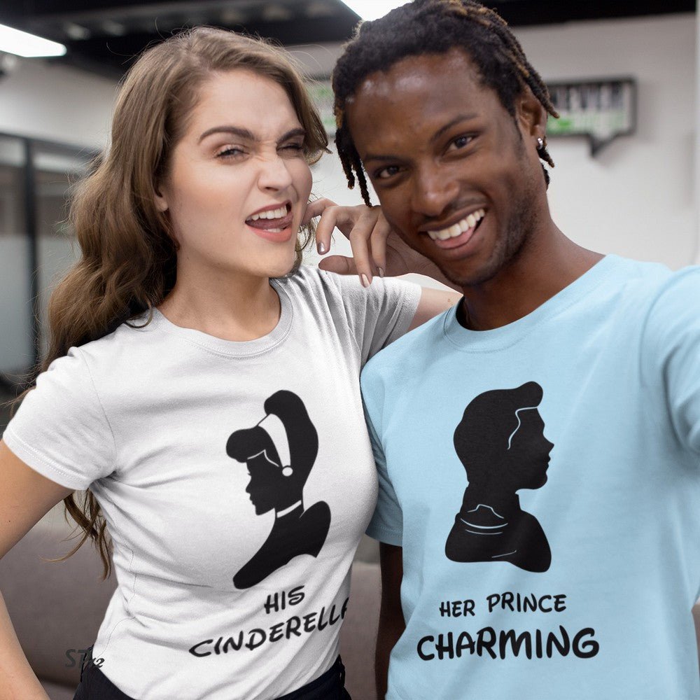 Stylish Couple t shirt with printed message‚ Her Prince Charming and His Cinderella. This matching couple outfit is fun to wear, show love and connection to each other and will create best keepsake photoshoot. This His and Her shirts unisex style tees will make you gain many compliments and every stylish best couple in the town.