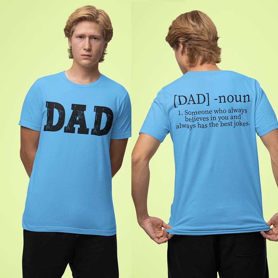 Introducing the Dad Defined Front back T Shirt – the perfect shirt for every dad out there. Made with high-quality materials, this shirt features an original design that celebrates fatherhood. Wear it with pride and show the world what it means to be a dad – 50% father, 50% superhero.