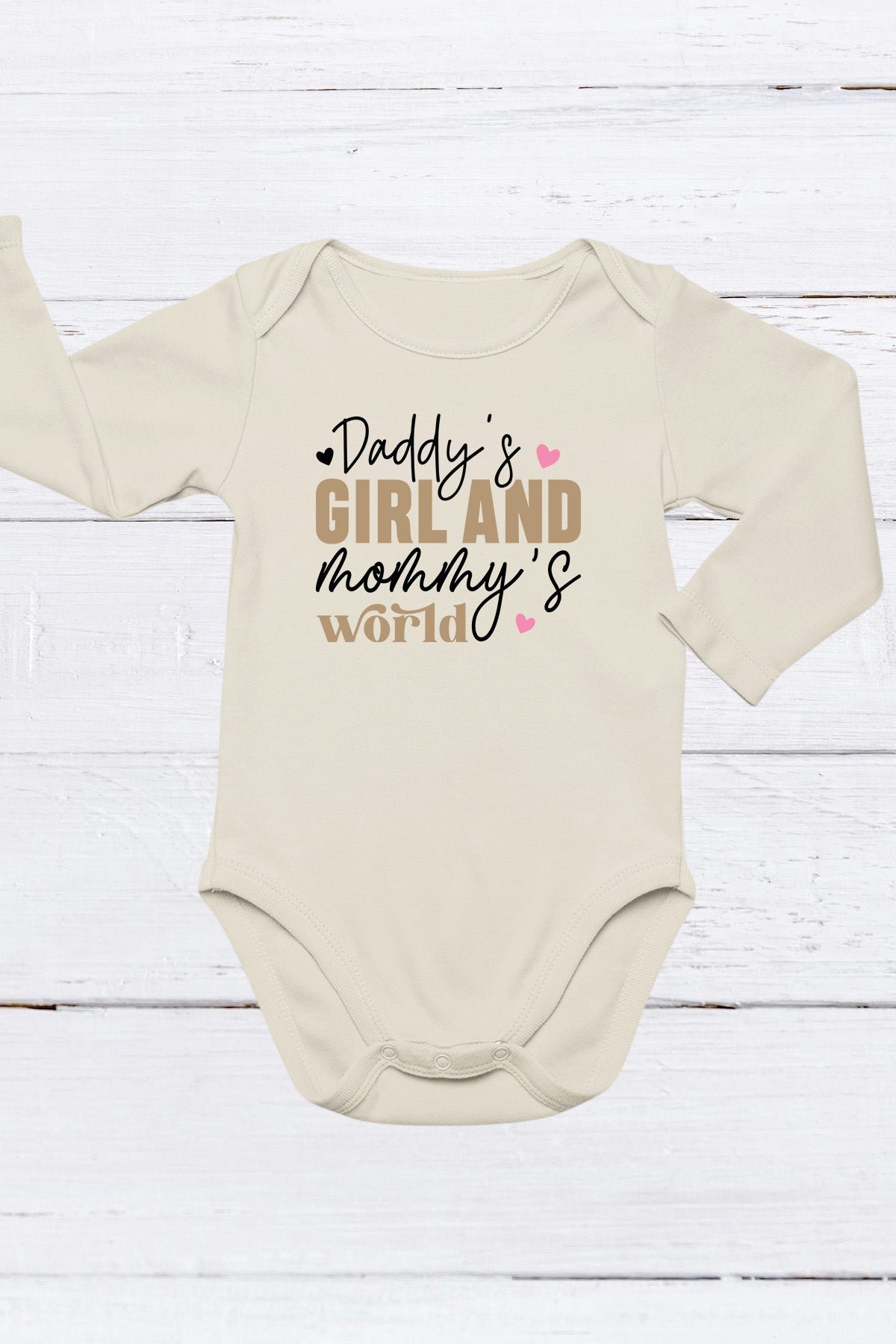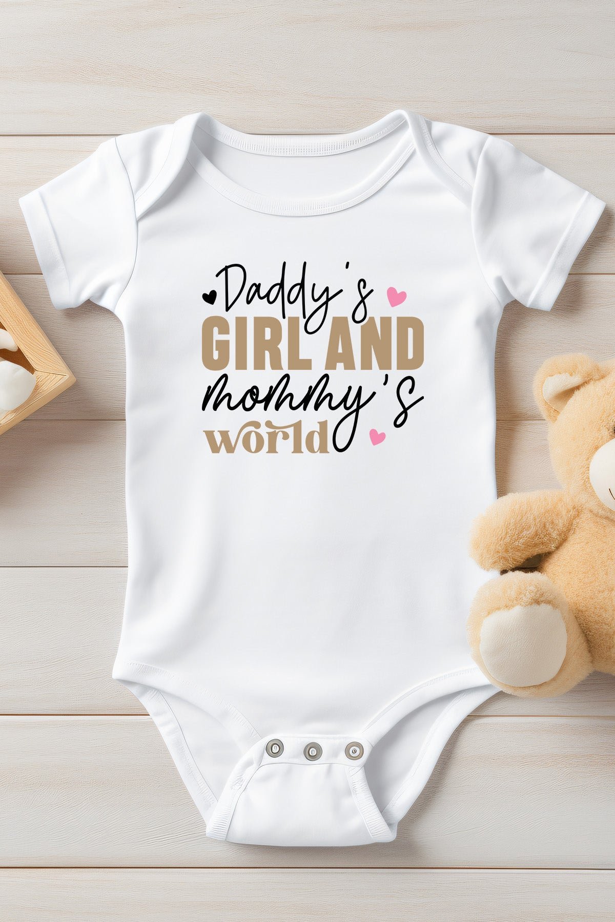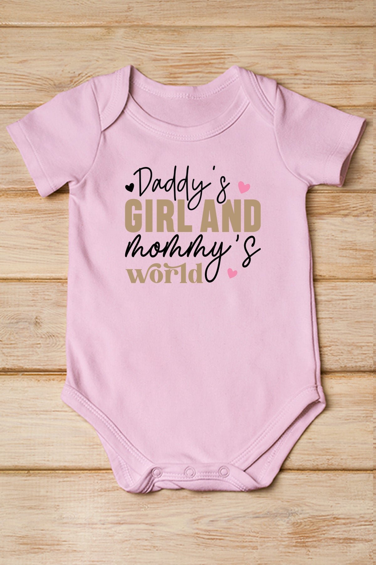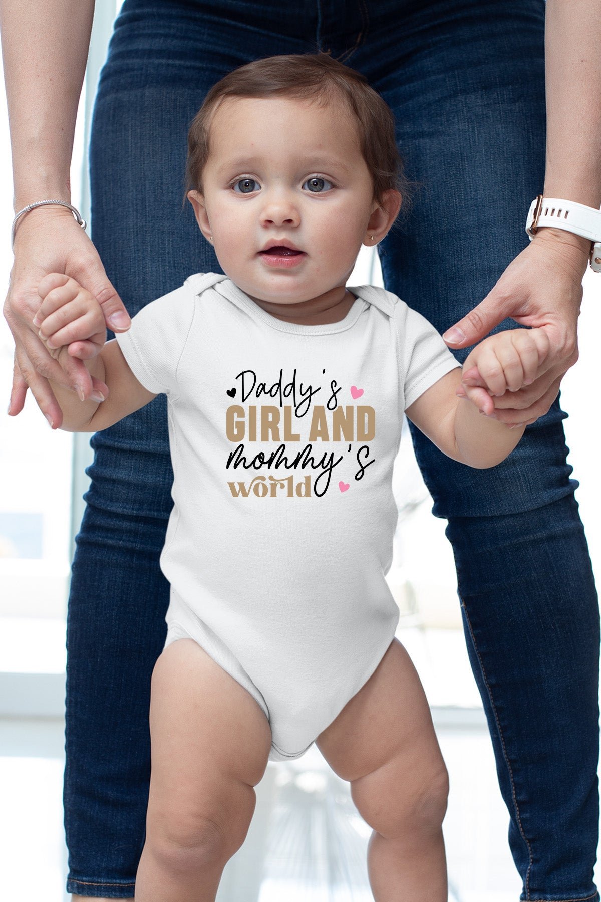 This baby bodysuit shows the precious bond between a father and daughter. With a heartwarming message of “Daddy’s Girl Mommy’s World,” this bodysuit is made from soft and comfortable material for your little one. A perfect gift for new dads and their daughters.