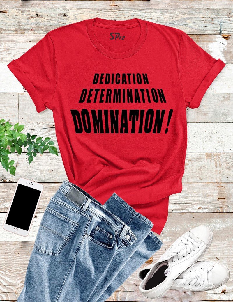 Dedication Determination Domination T Shirt is printed with the message Dedication Determination Domination.Fan of motivational quotes or funny memes then you will like our slogan tshirt. These soft cotton tshirts are stylish and comfy. Funny t shirts that can give someone a laugh or sparkling smile and happy time. This slogan t shirt will get an attention and compliment.