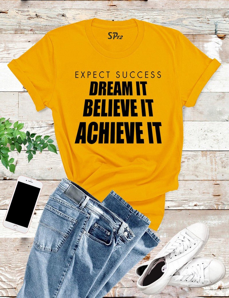 Dream it Believe It Achieve It T Shirt is printed with the message Dream it Believe It.Fan of motivational quotes or funny memes then you will like our slogan tshirt. These soft cotton tshirts are stylish and comfy. Funny t shirts that can give someone a laugh or sparkling smile and happy time. This slogan t shirt will get an attention and compliment.