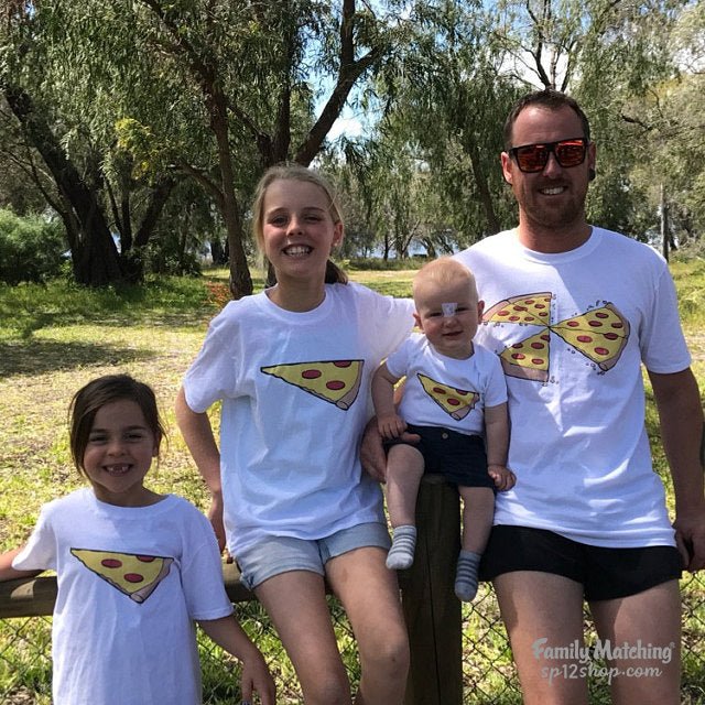 Family Matching Pizza T Shirts are stylish and printed with quality printing method to make everyone in the family happy. These family shirts are designed for dad, mum, brother and sister baby. These matching clothes will be a lovely gift for family.