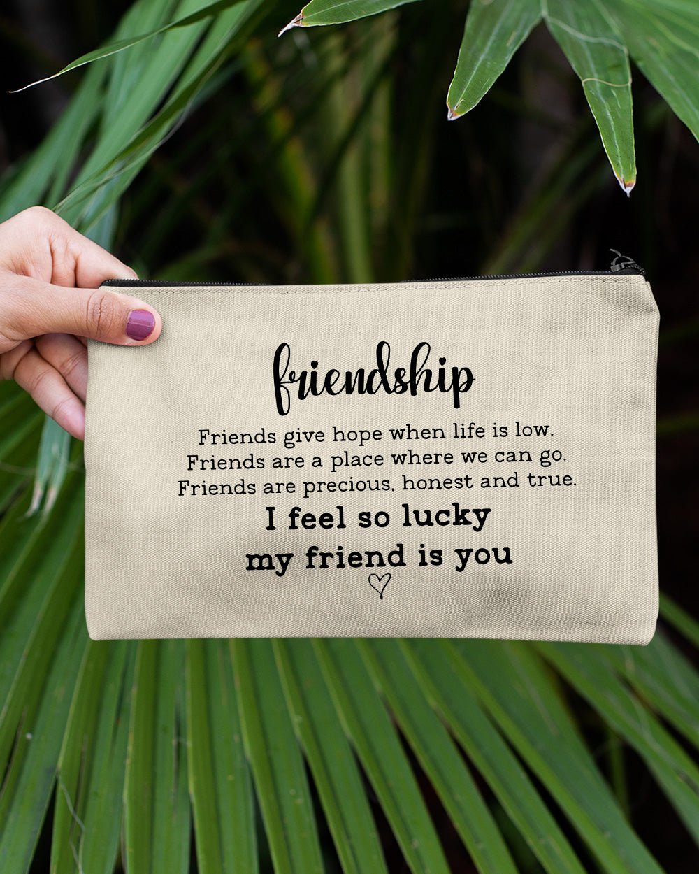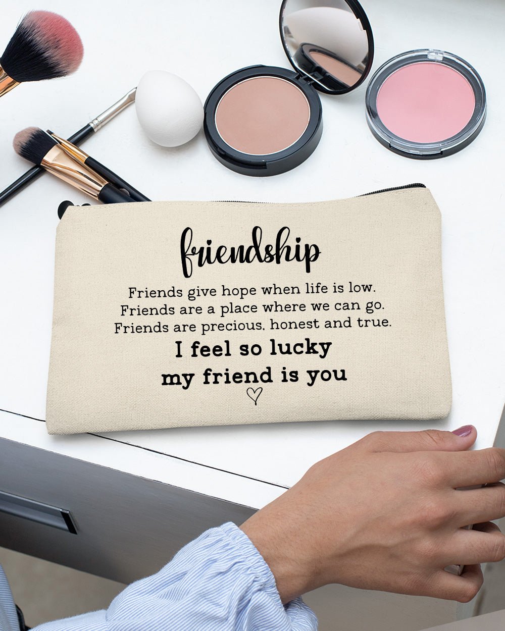 This Friendship Makeup Bag is the perfect gift for your friend. Made with high-quality materials, it is both durable and stylish. The spacious compartment allows for easy storage of all your makeup essentials. Show your friend how much they mean to you with this thoughtful and functional gift.