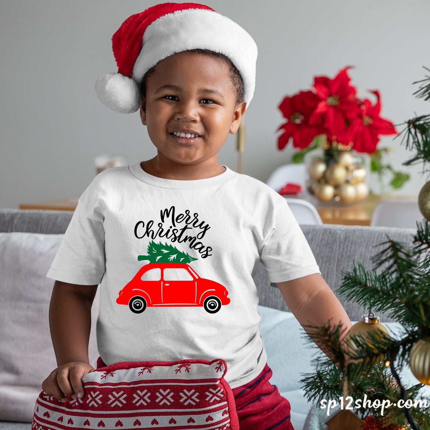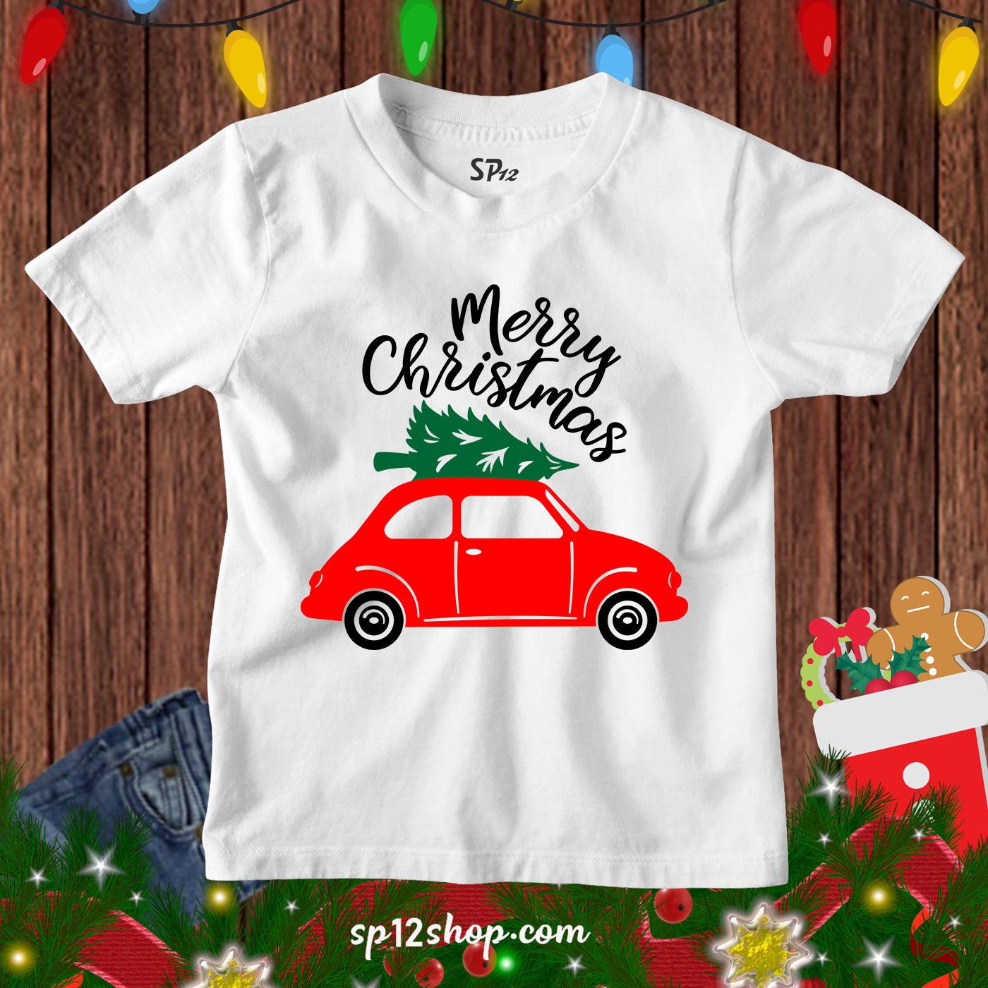Funny Gift Kids T Shirt Merry Christmas Red Car Tree