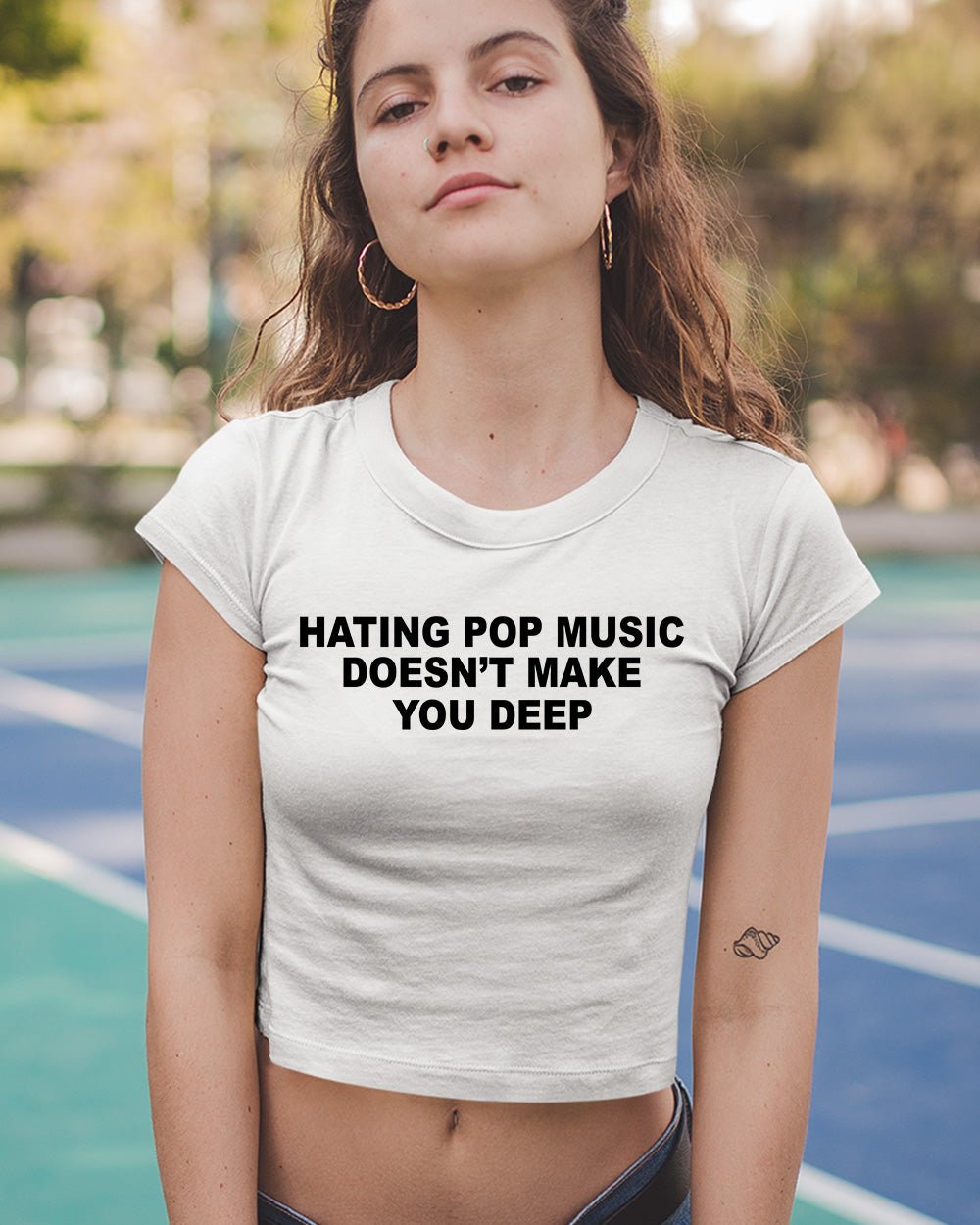 Stay stylish while expressing your unique music tastes with our hating Pop Music Doesn’t Make You Deep Baby Crop Top. Made with high-quality materials, this crop top is perfect for any music lover looking to make a statement. Embrace your individuality and show the world that not all music has to be mainstream.