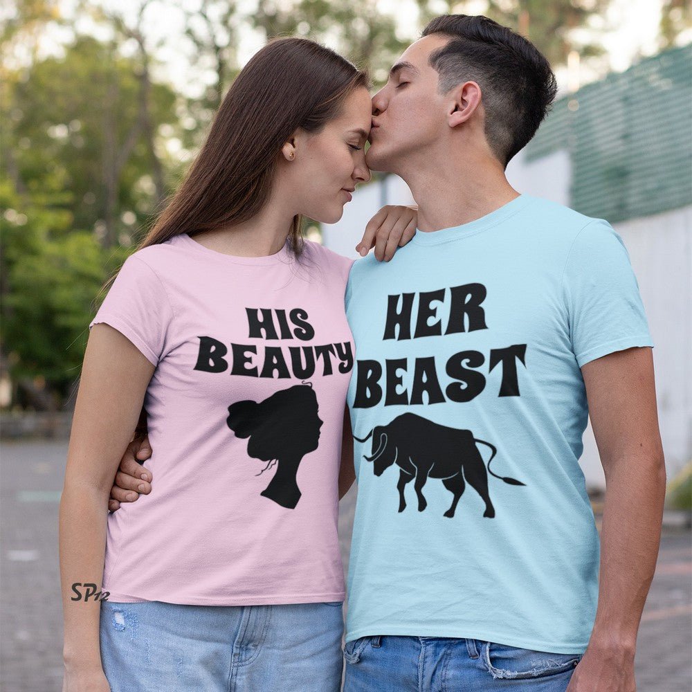 Stylish Couple t shirt with printed message His Beauty and Her Beast. This matching couple outfit is fun to wear, show love and connection to each other and will create best keepsake photoshoot. This His and Her shirts unisex style tees will make you gain many compliments and every stylish best couple in the town.