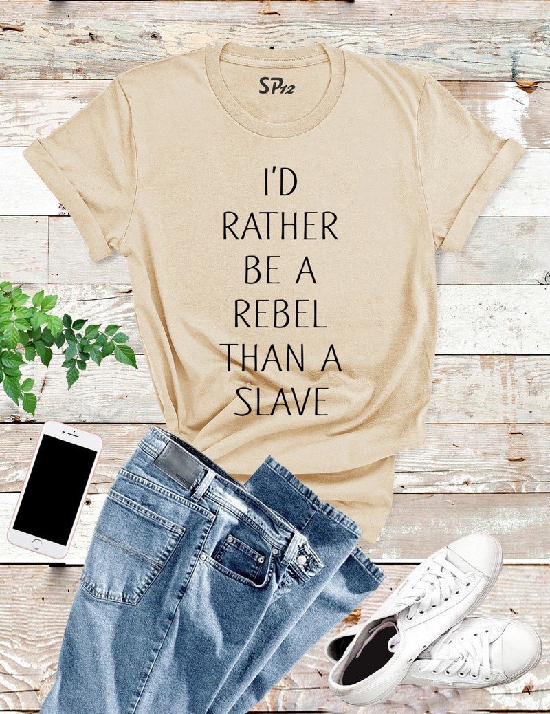 I’d Rather Be A Rebel Than A Slave T Shirt is printed with the message Rebel. Fan of motivational quotes or funny memes then you will like our slogan tshirt. These soft cotton tshirts are stylish and comfy. Funny t shirts that can give someone a laugh or sparkling smile and happy time. This slogan t shirt will get an attention and compliment.