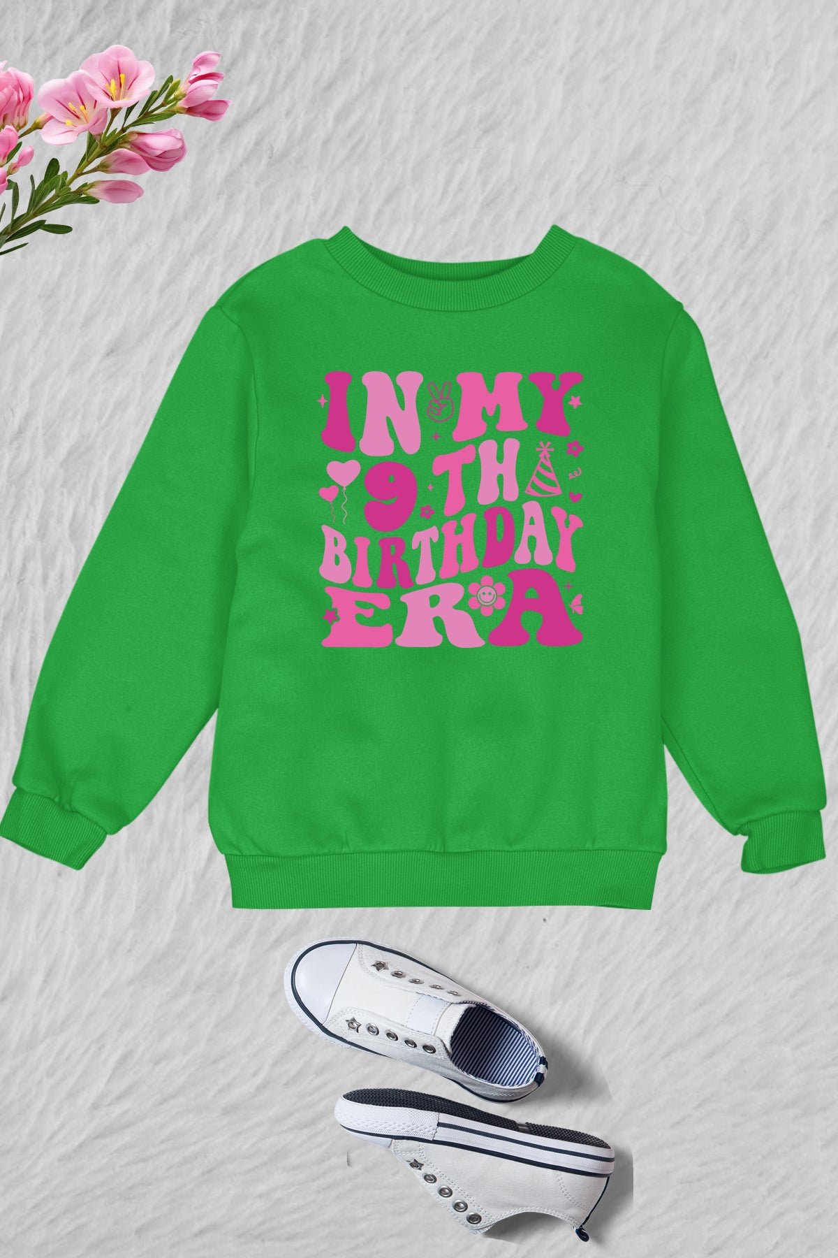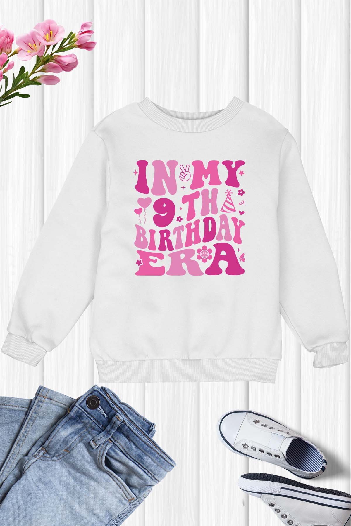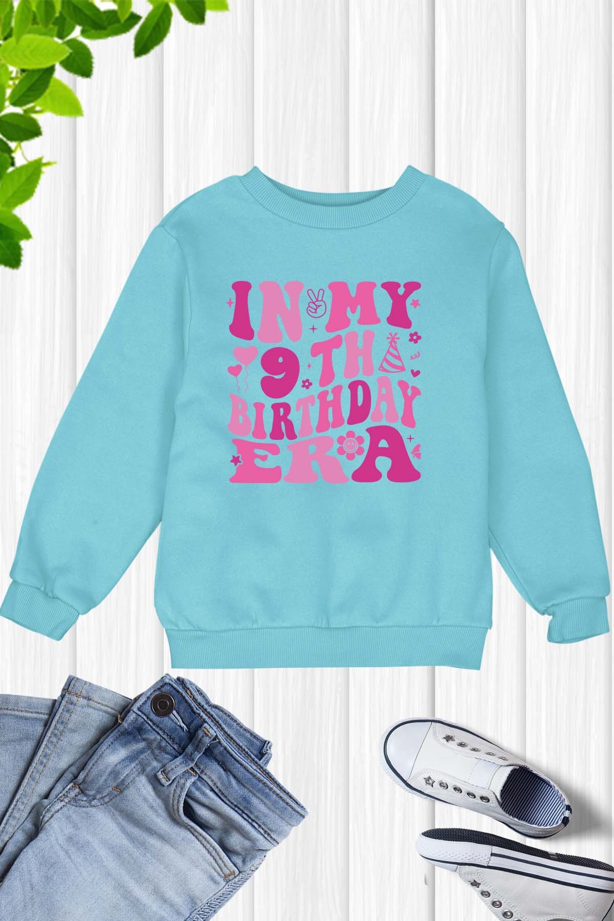 Celebrate your child’s special day with our “In My 9th Birthday era” sweatshirts. Made with cozy material, these sweatshirts are perfect for keeping your little one warm and stylish. In addition, the unique design and durable construction make for a lasting memento of this milestone birthday.