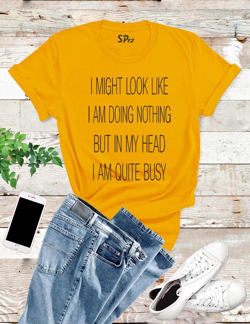 In My Head Quite Busy Funny T Shirt I Am Doing Nothing But In My head I Am Quite Busy is printed with the message .Fan of motivational quotes or funny memes then you will like our slogan tshirt. These soft cotton tshirts are stylish and comfy. Funny t shirts that can give someone a laugh or sparkling smile and happy time. This slogan t shirt will get an attention and compliment.