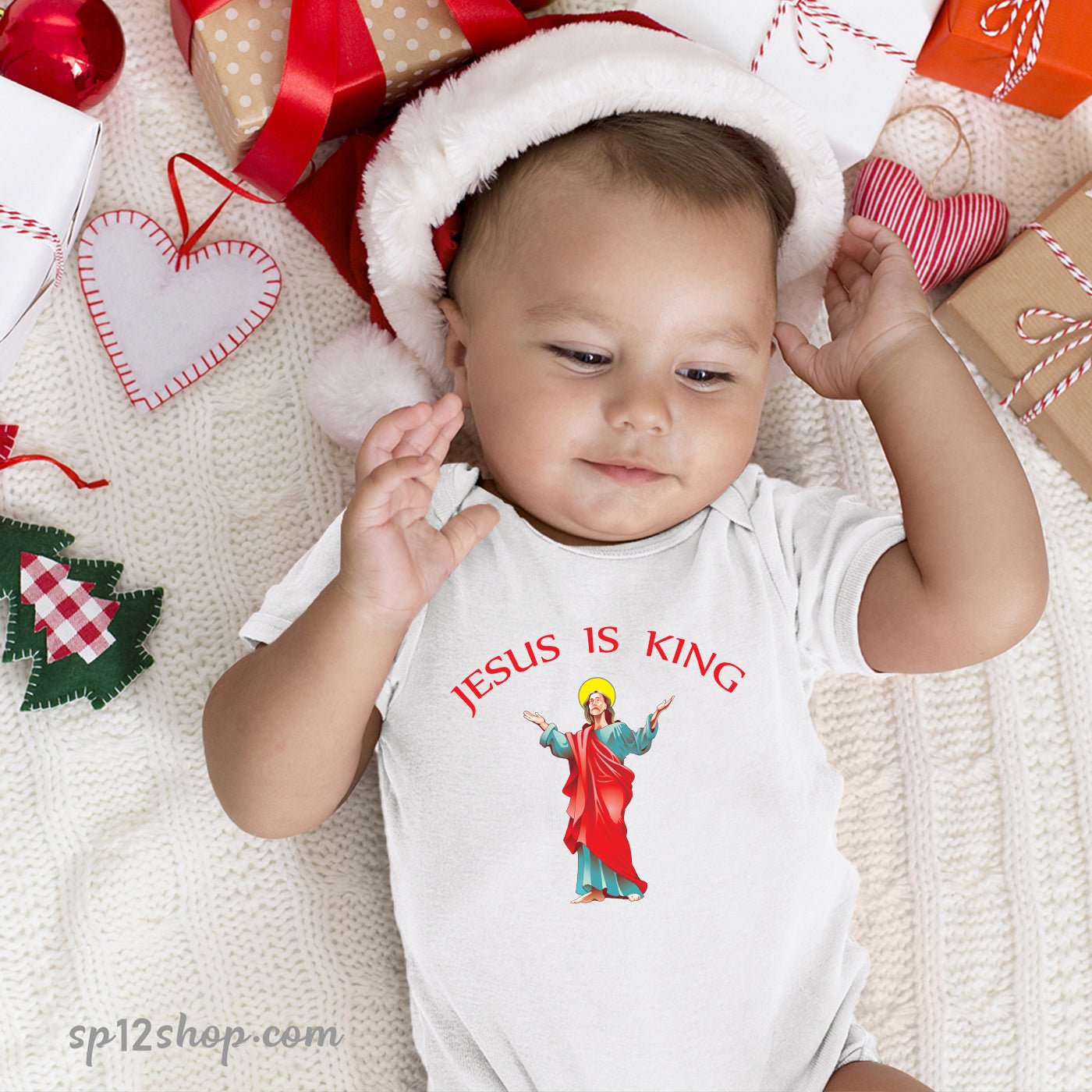 This Christian baby bodysuit features the powerful message of “Jesus Is King” and expresses faith and love through a Bible verse. Made with high-quality material, it offers comfort and durability for your little one. Show your devotion and spread the message of love with this charming bodysuit.